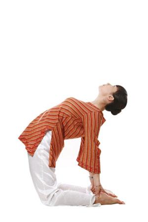 方法:跪立,上半身挺直,双手扶住腰部。吸气时,双手轻推髋部向前,双肩后仰,将胸部向上挺起,向上看。如果可以,可用双手抓住脚踝,加大动作的强度。呼气时,身体慢慢向上挺直,放松双臂,还原。